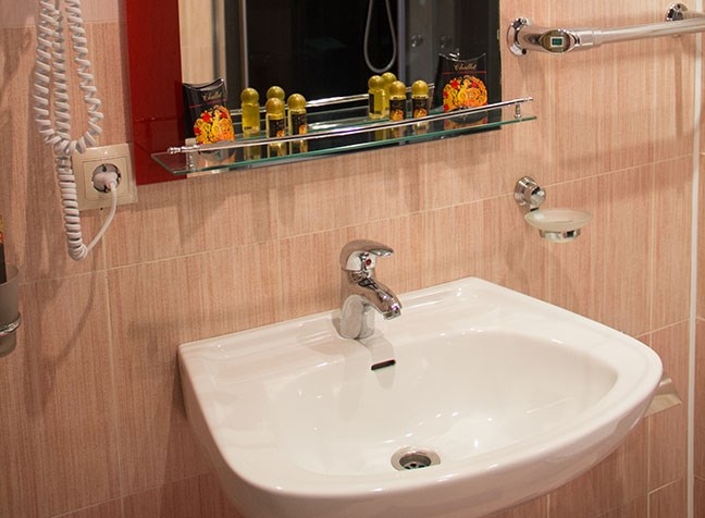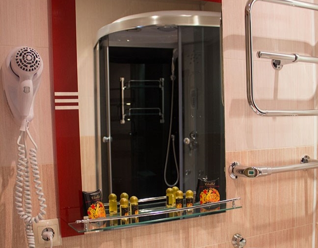 Площадь номера - 40-42 кв.м. 2 осн. места. 1 доп. место. Мебель: вешалка, диван раскладной, зеркало, комод, кровать двуспальная, прикроватные тумбочки, столик журнальный, стул, шкаф-купе. Оборудование: кондиционер, мини-холодильник, сейф, телевизор ЖК, телефон, чайный набор посуды, электрочайник. Санузел: с душем, туалетные принадлежности, фен. Сервис: Wi-Fi бесплатно, room-сервис, смена полотенец, смена постельного белья, уборка номера, услуги внутренней телефонной связи.