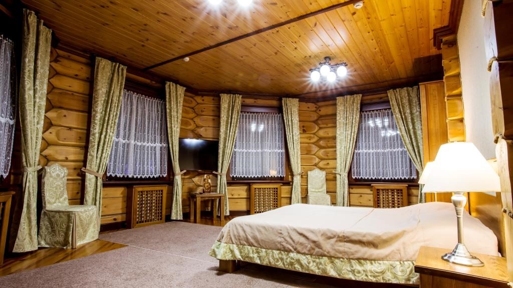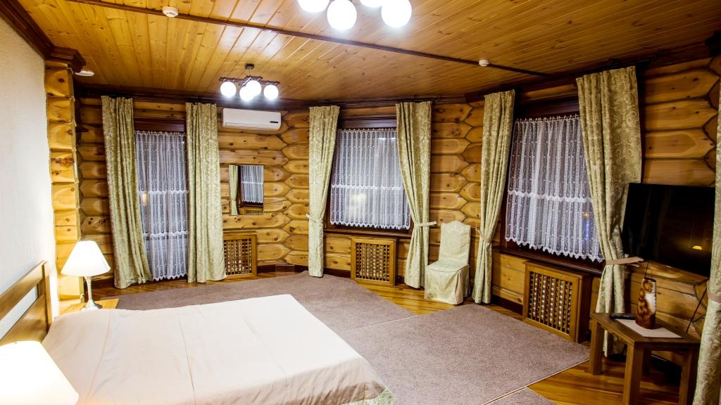 Площадь номера - 80 кв.м. 2 осн. места. 2 доп. места. Мебель: вешалка, диван, зеркало, кресло, кровать двуспальная, прикроватные тумбочки, столик журнальный, стул, шкаф (стенка-горка), шкаф-купе. Оборудование: гладильная доска, кондиционер, мини-холодильник, сейф, телевизор ЖК, телефон, утюг, чайный набор посуды, электрочайник. Санузел: биде, с ванной/душем, туалетные принадлежности, фен. Сервис: Wi-Fi бесплатно, room-сервис, смена полотенец, смена постельного белья, уборка номера, услуги внутренней телефонной связи.