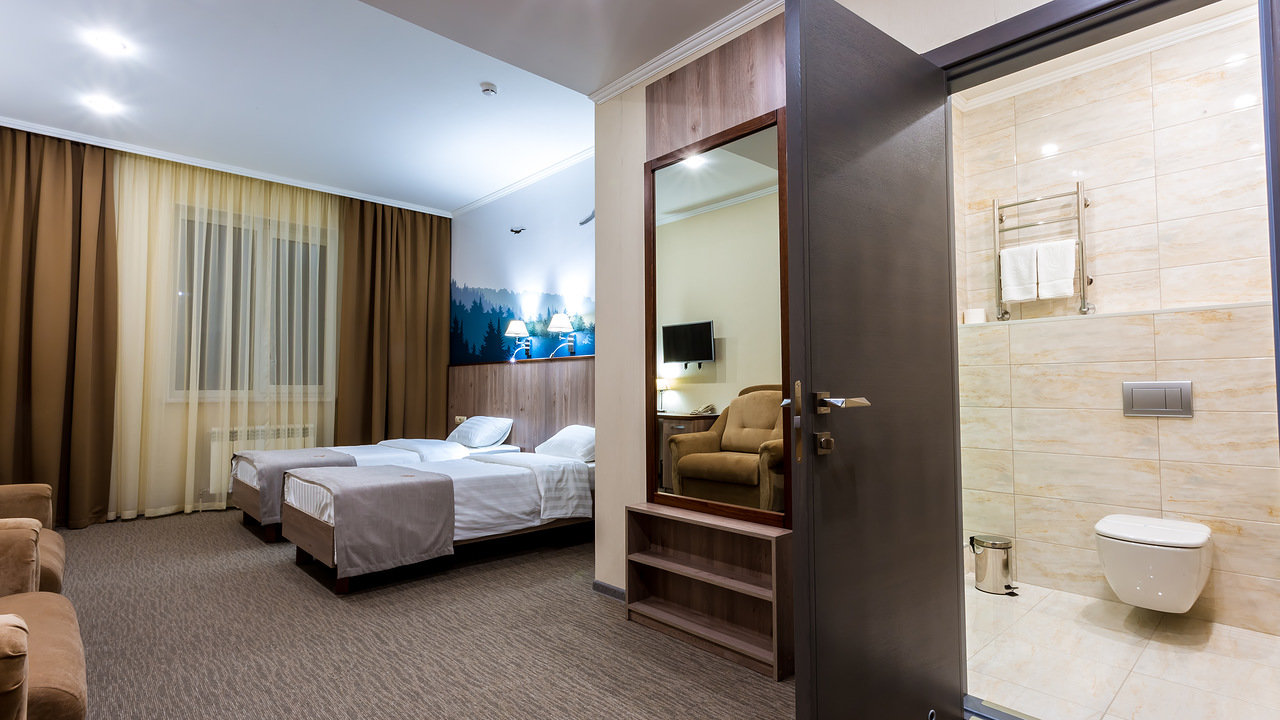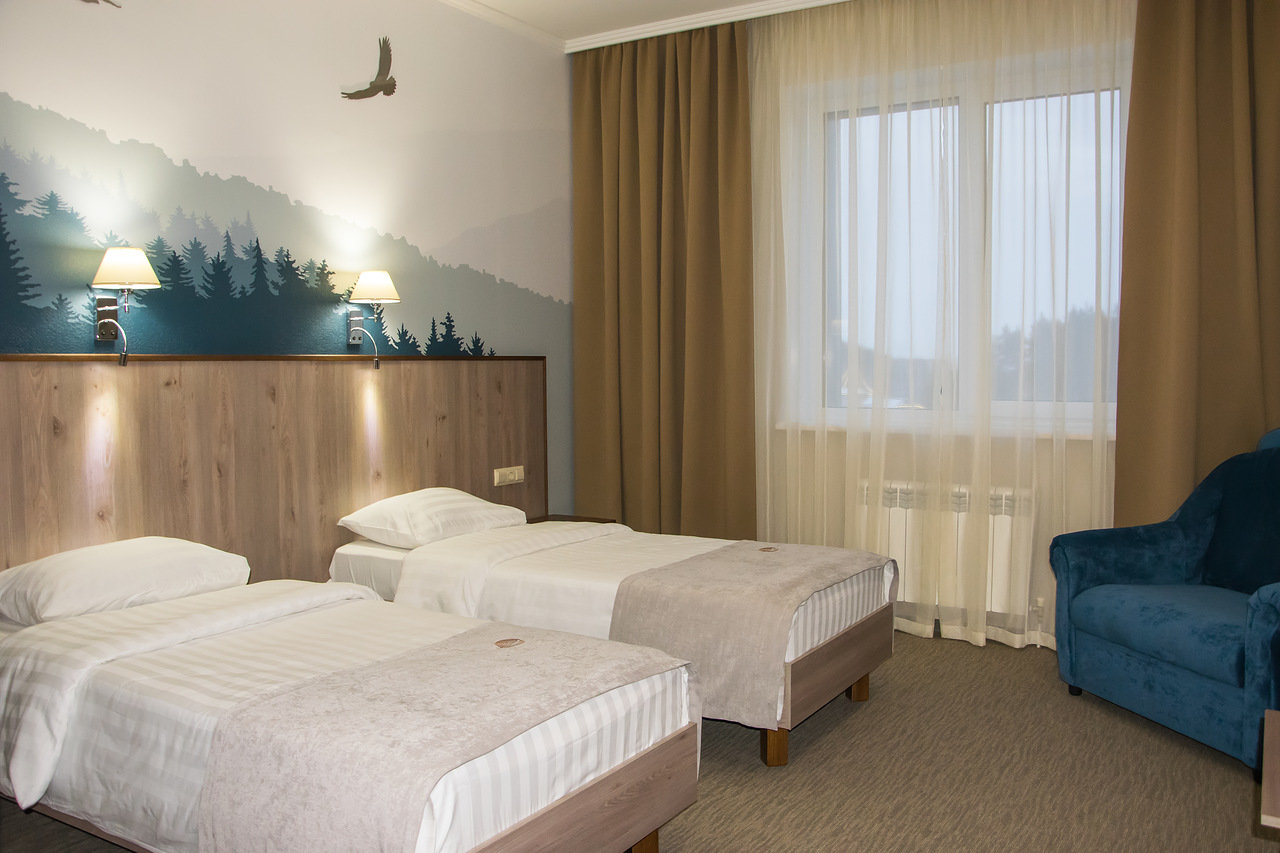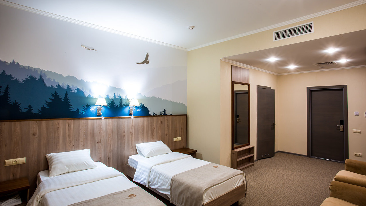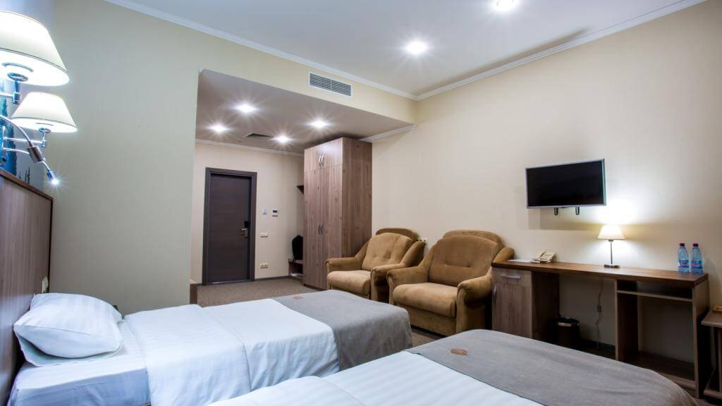 Площадь номера - 25-31 кв.м. 2 осн. места. 1 доп. место. Мебель: вешалка, зеркало, кресло-кровать, кровати односпальные /одна двуспальная кровать, прикроватные тумбочки, стол, шкаф. Оборудование: кондиционер, мини-холодильник, сейф, сплит-система, телевизор ЖК, телефон, чайный набор посуды, электрочайник. Санузел: с душем, тапочки, туалетные принадлежности, фен, халат. Сервис: Wi-Fi бесплатно, room-сервис, смена полотенец, смена постельного белья, уборка номера, услуги внутренней телефонной связи.